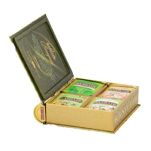 8 foil enveloped tea bags x 4 types of tea packed into a metal caddy.