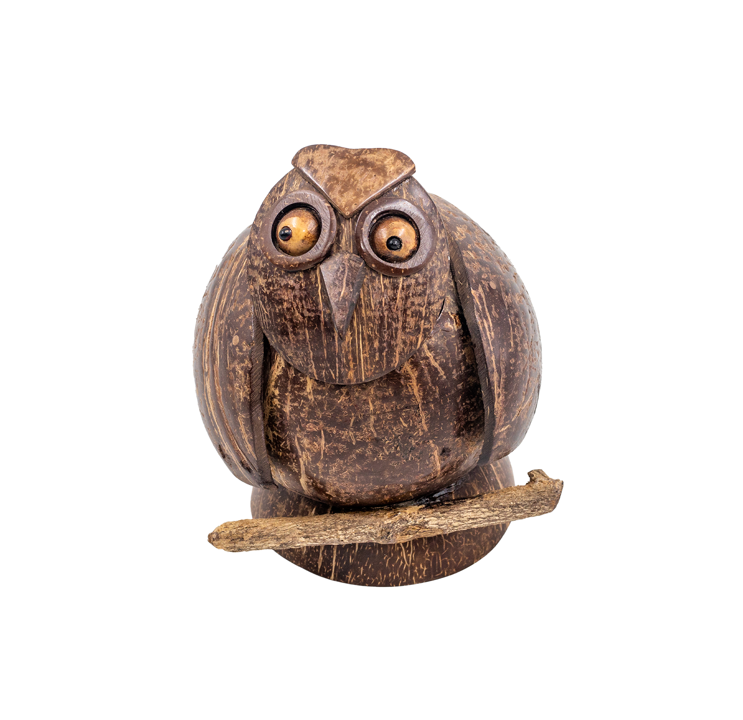 This owl ornament is made entirely with coconut shell. Either cranberry seeds can be inserted into the owl’s eyes.