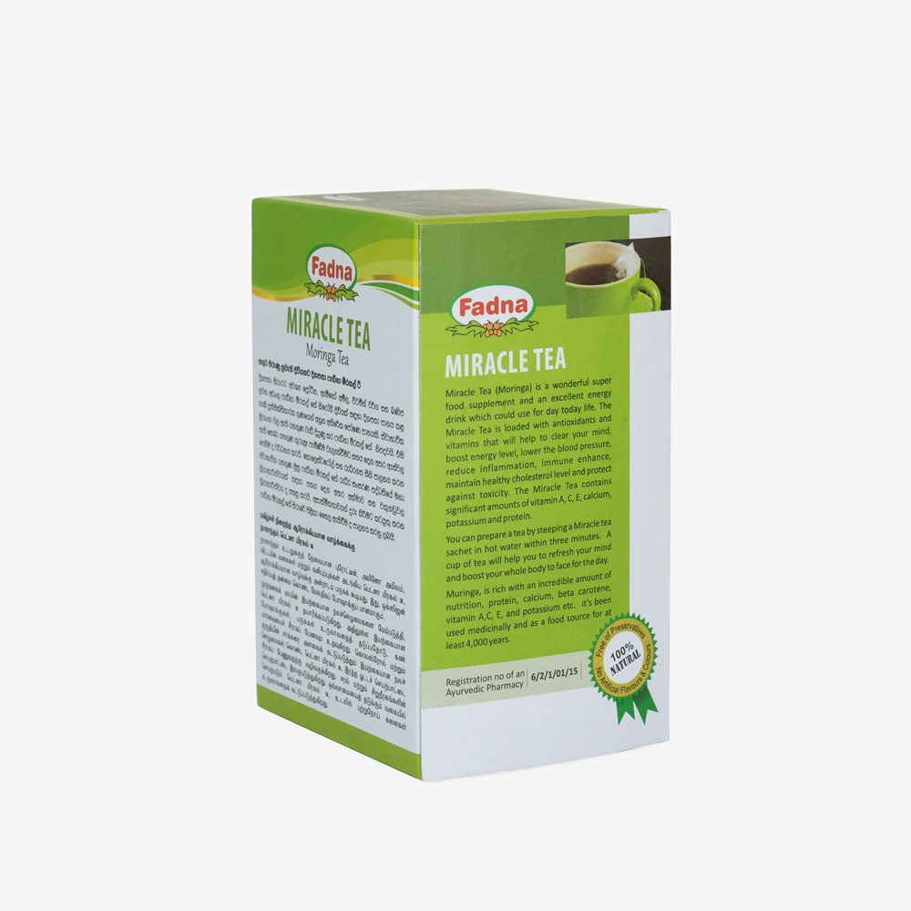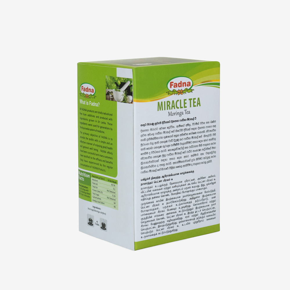 Fadna Miracle tea consists with the goodness of Moringa (Moringa oleifera) and is a herbal food supplement rich in many essential vitamins like A, C, E, calcium, potassium and proteins etc. This is an excellent energy drink that is rich in anti-inflammatory and anti-bacterial properties, which has been used to prevent anemia, respiratory difficulties and skin issues etc.