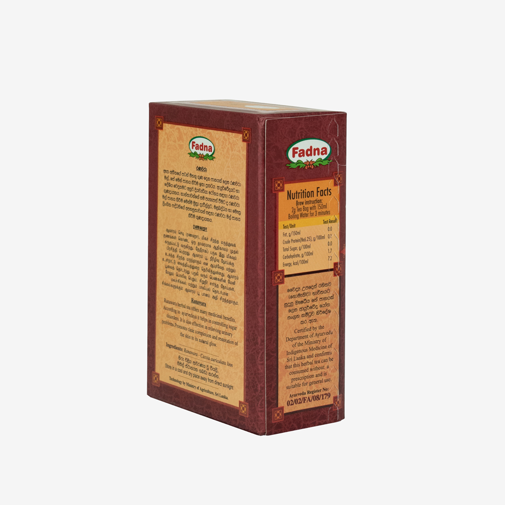 Ranawara tea is most popular to control sugar disorders and soothe body aches and pain. Moreover, this tea is more often served to regulate body heat and cool the system from within. Regular usage of Ranawara tea can help eliminate toxins and bad odour, while restoring sexual vitality.