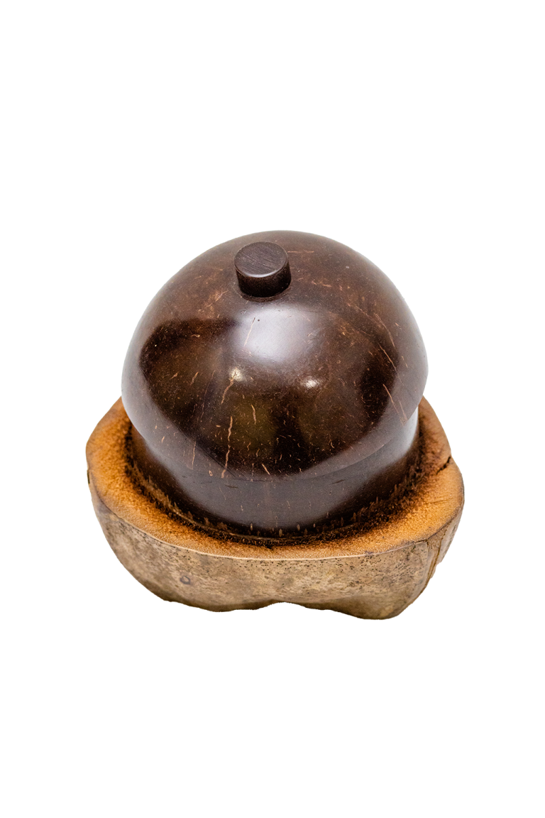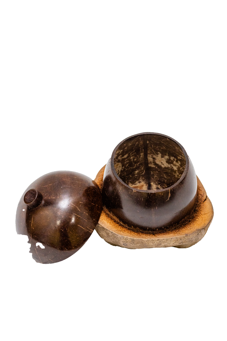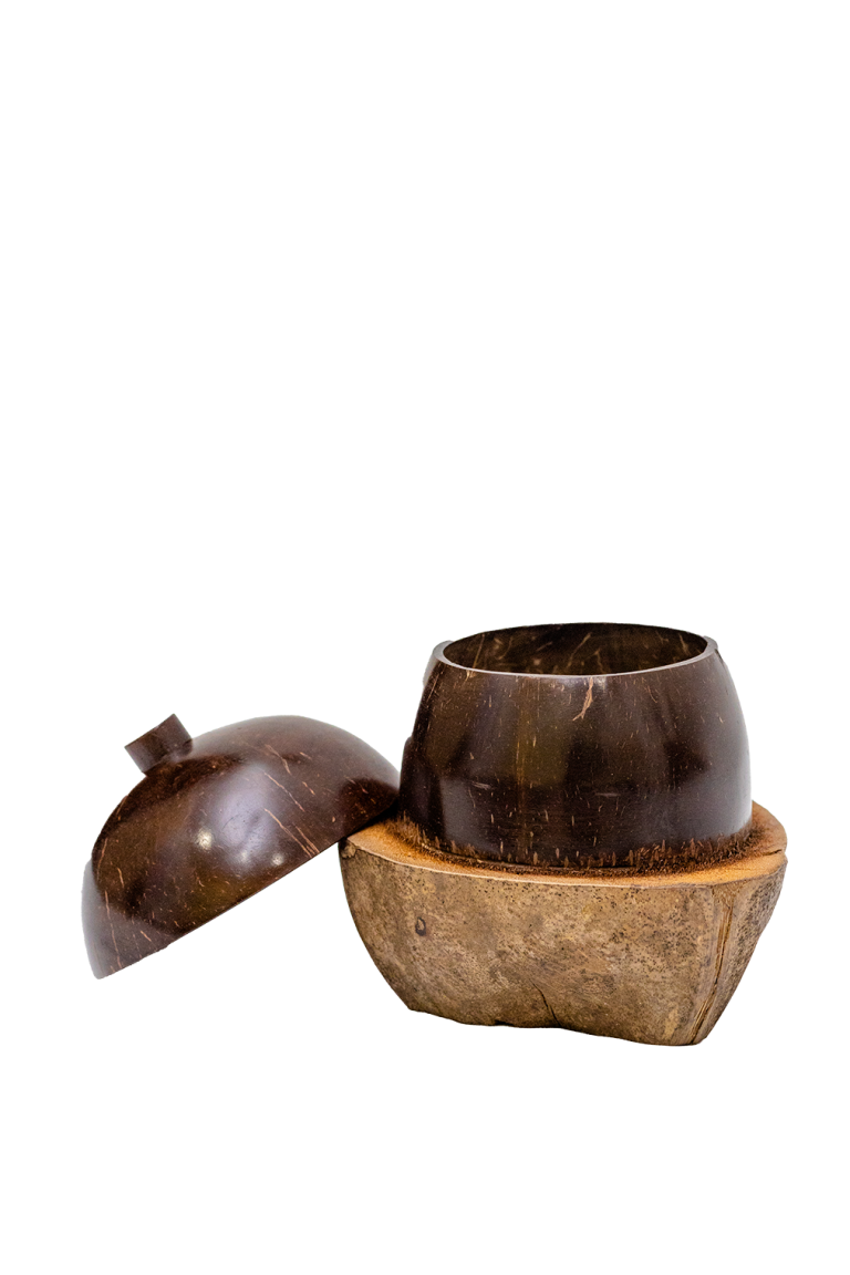 This food storage container is made using coconut shell and husk. It can be used to store food for a long time with less wastage due to the coconut husk.