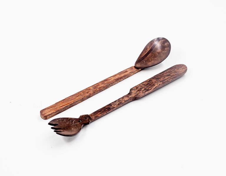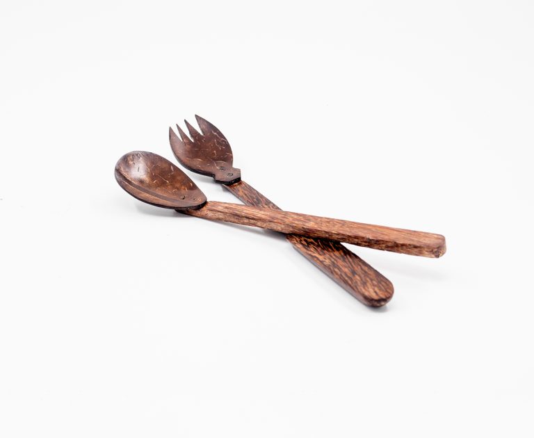 The handles of the fork and spoon are made with the wood obtained from the coconut tree or fishtail palm tree. The bowl of the spoon and tine of the fork are made with coconut shell. This fork and spoon are useful and durable kitchen utensils.