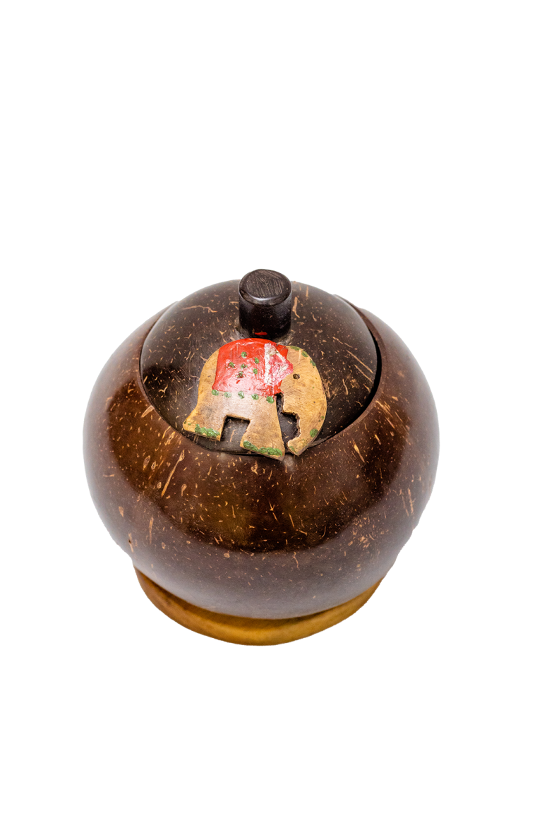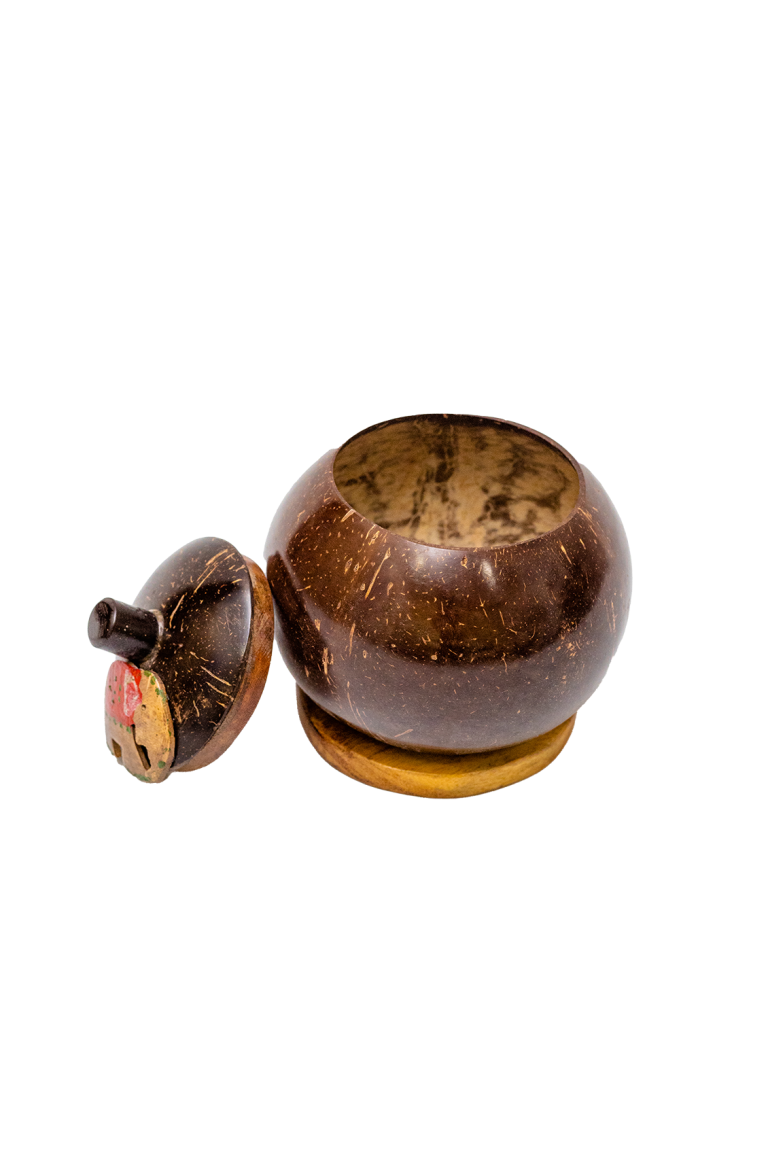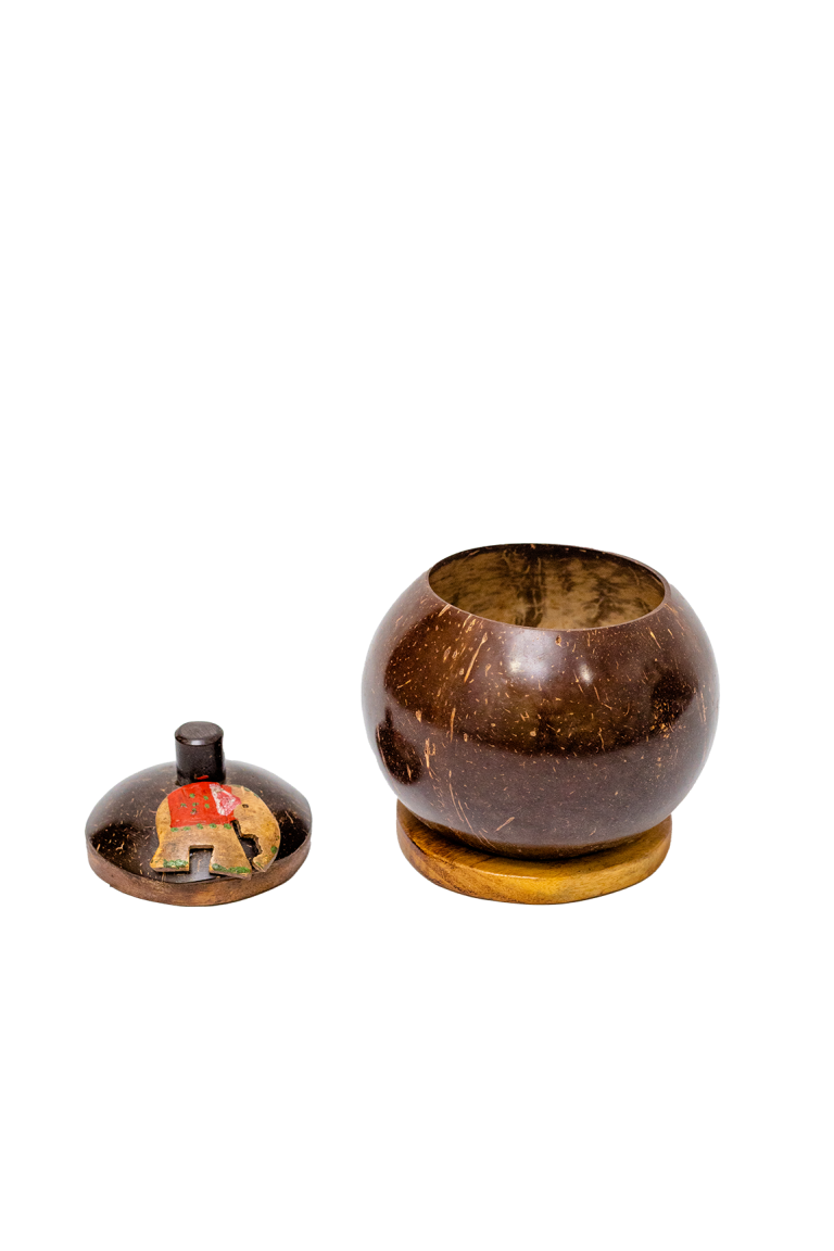 This Wood round bottom bowl is made entirely with coconut shell. It can be used to store things like sugar, milk powder, tea dust, etc. The bowl can be customized to any size and design and comes with a spoon too.