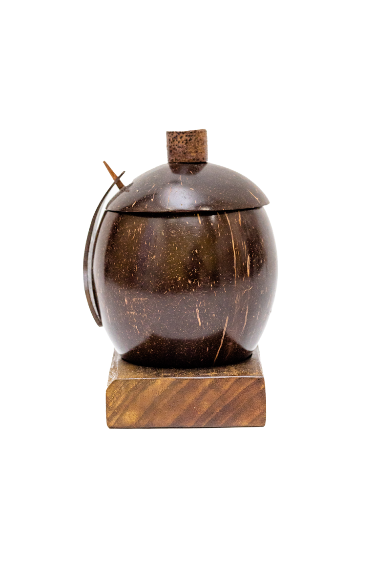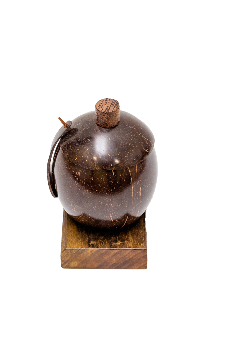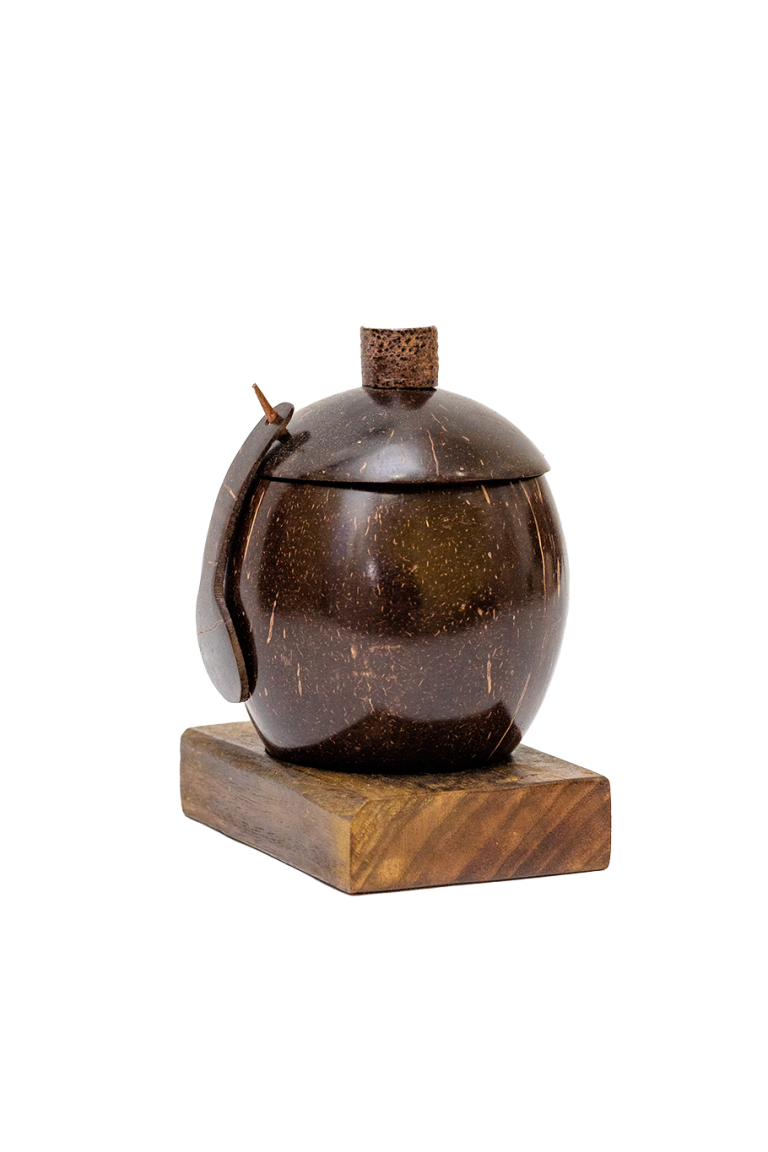 This spice jar is made entirely with coconut shell. A single spice jar or sets of 3, 4, or 5 spice jars could be made according to customized designs.